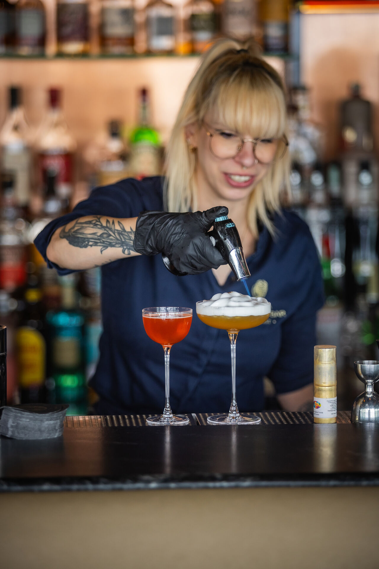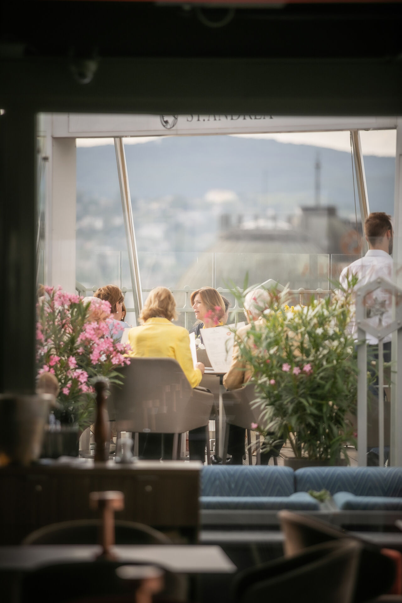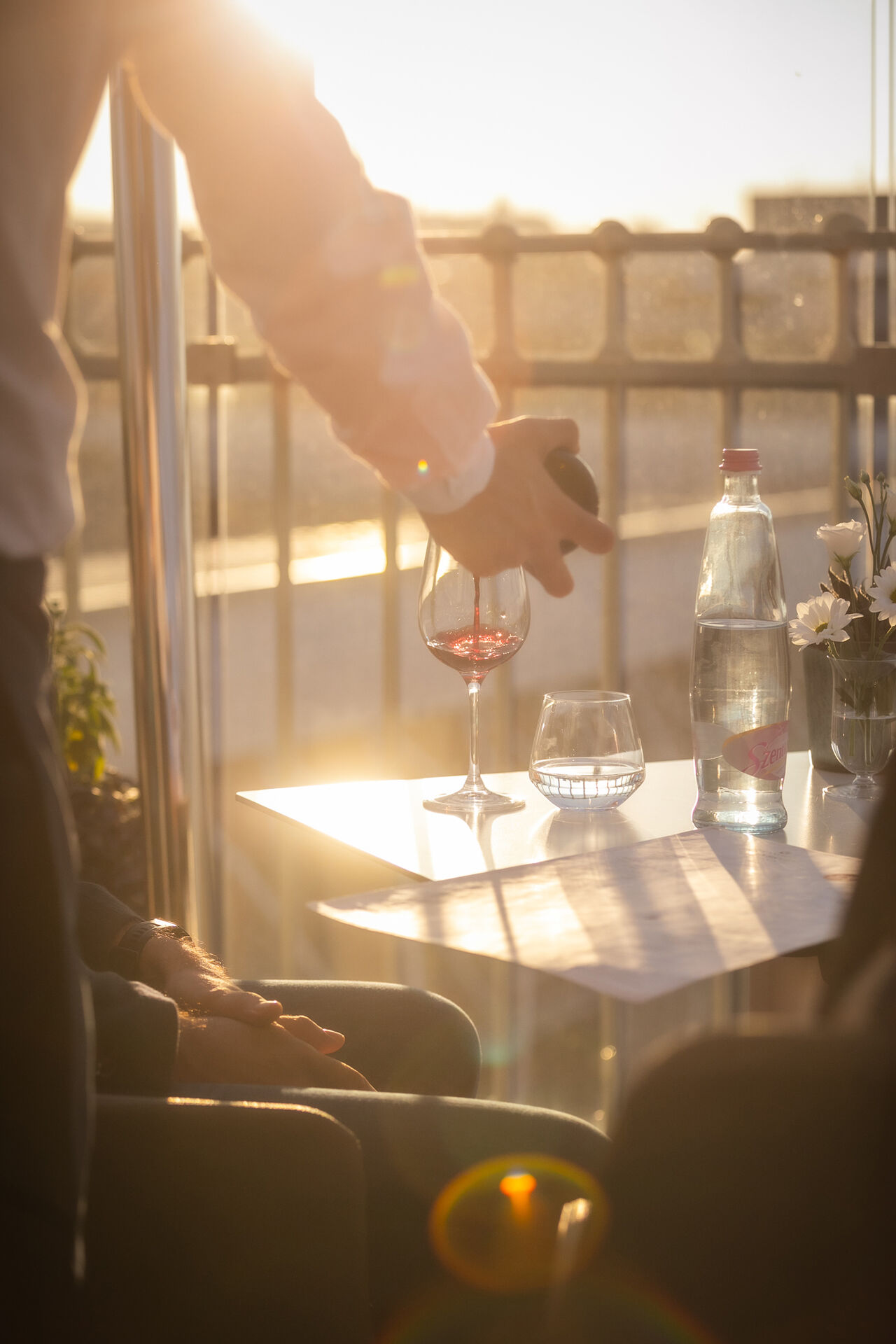 The casual but elegant rooftop bar can be accessed by elevator, you can enjoy a selection of fine wines, cool cocktails and light bar food on the terrace or in the indoor bar area. Memorable evenings are guaranteed by live music, a DJ with vinyl, a fun, lively service and exciting recommendations from a qualified sommelier.